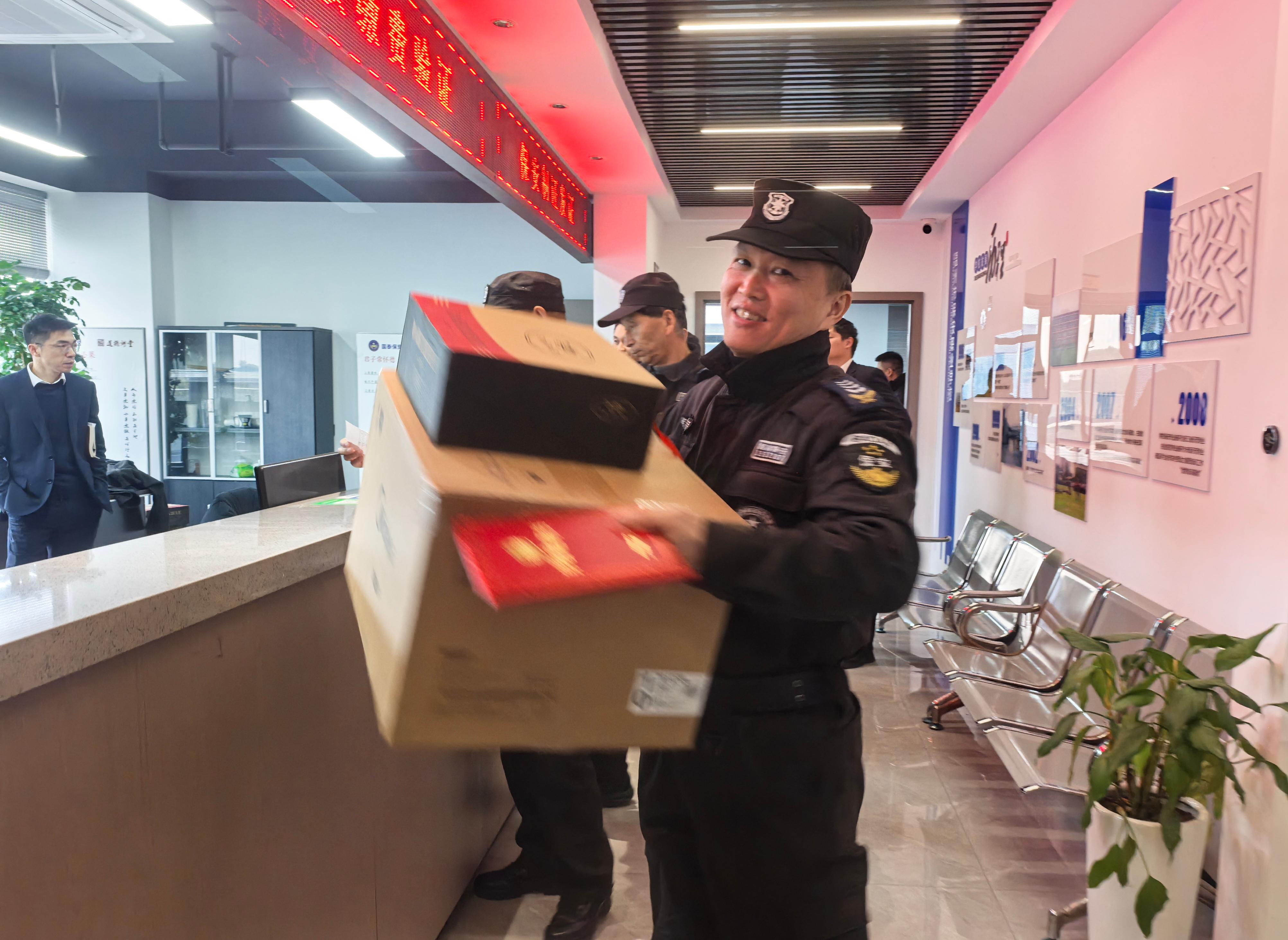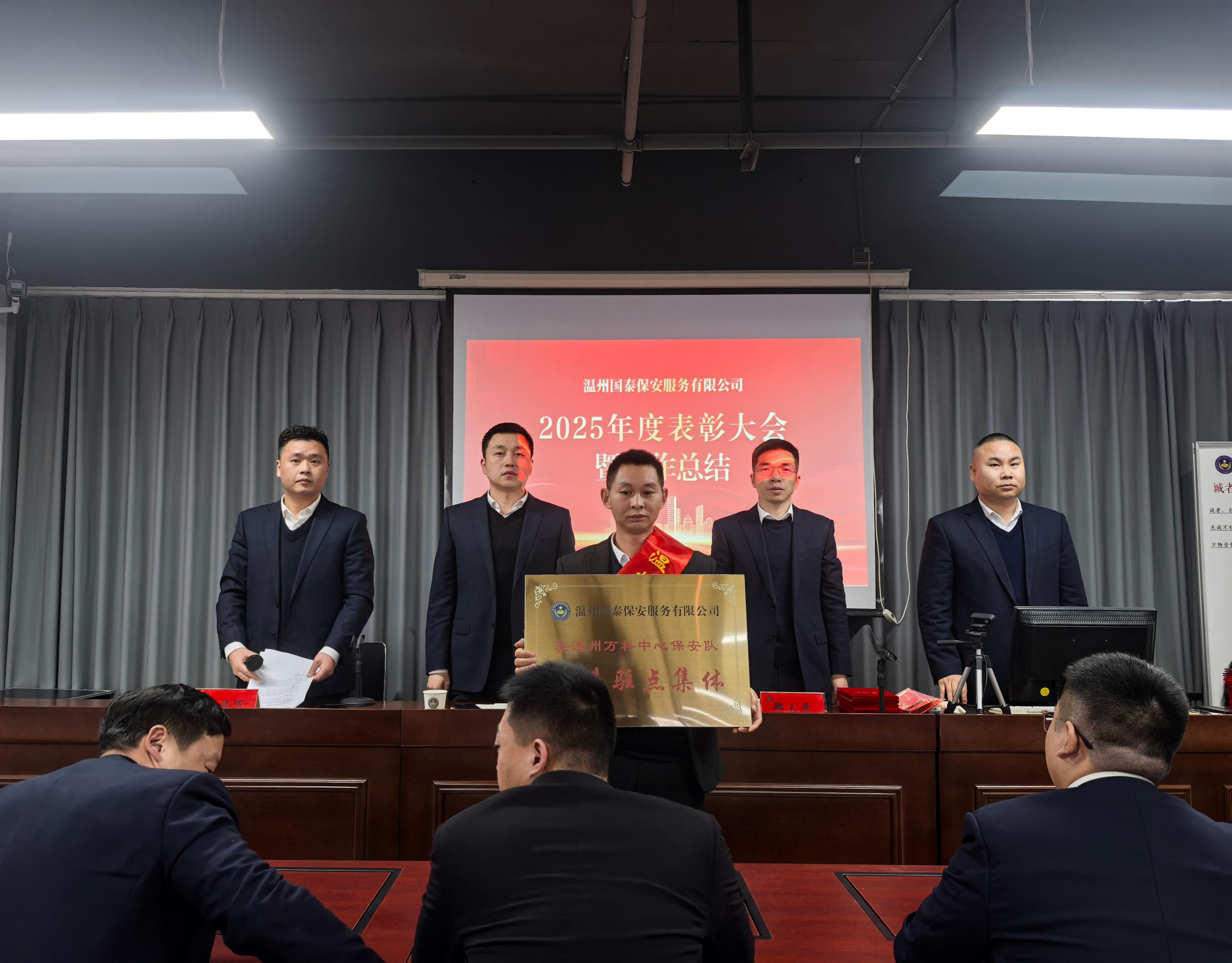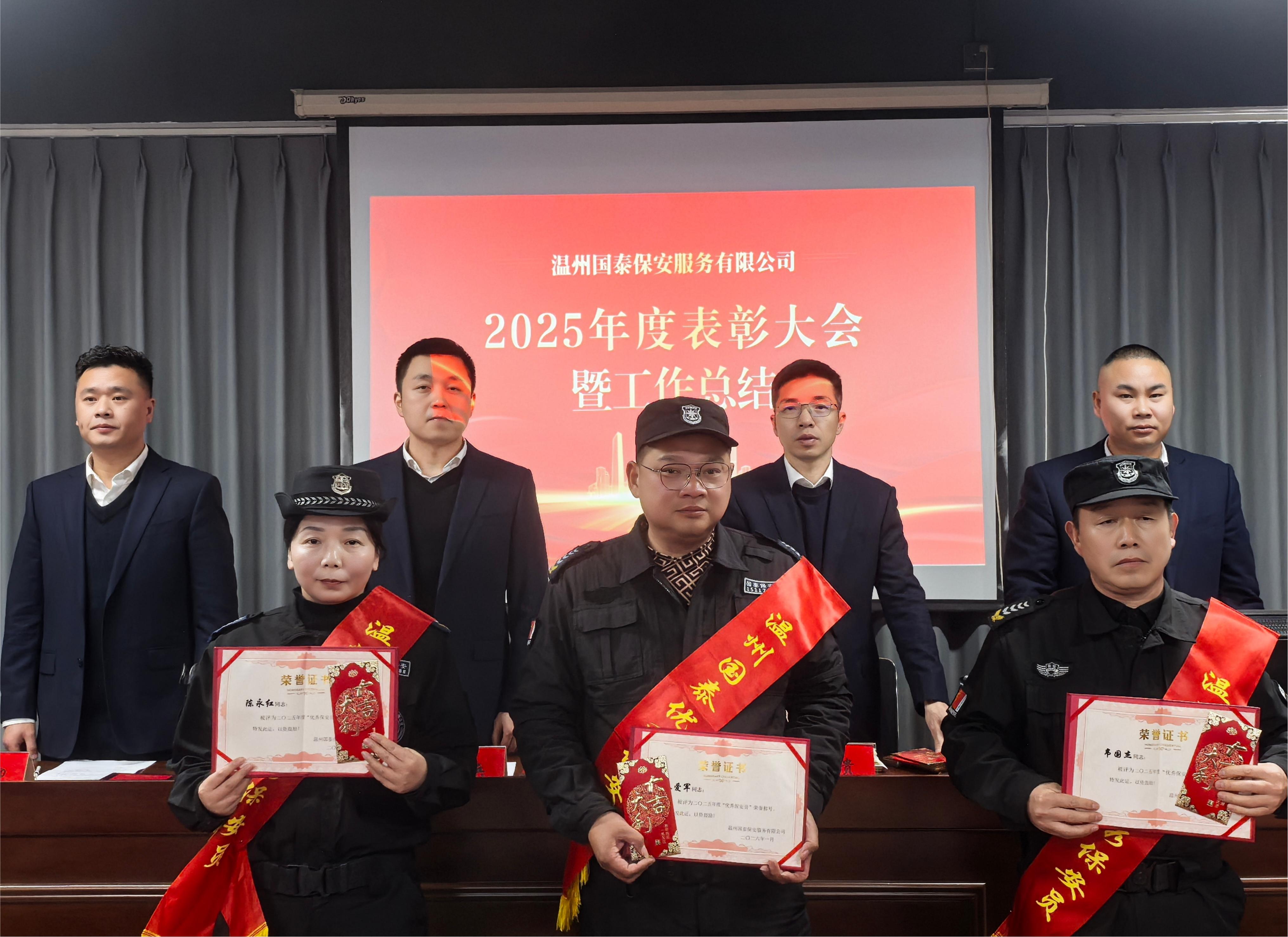 大会由保安部副经理屠德印主持。会上,保安部应经理首先作2025年度人防工作报告,系统总结全年安全保障成果,全年为180家客户单位服务,2900余名保安覆盖多个领域,案例入选省保安协会创新案例,客户满意度超98%,并围绕2026年重点任务提出规划,强调以更高标准筑牢安全防线。随后,公司副总经理金露兵宣读表彰决定,对先进驻点集体、优秀骨干以及优秀安保人员进行表彰并颁发奖品。获奖代表们身披绶带、手捧证书,现场掌声如雷,充分彰显出榜样的力量。