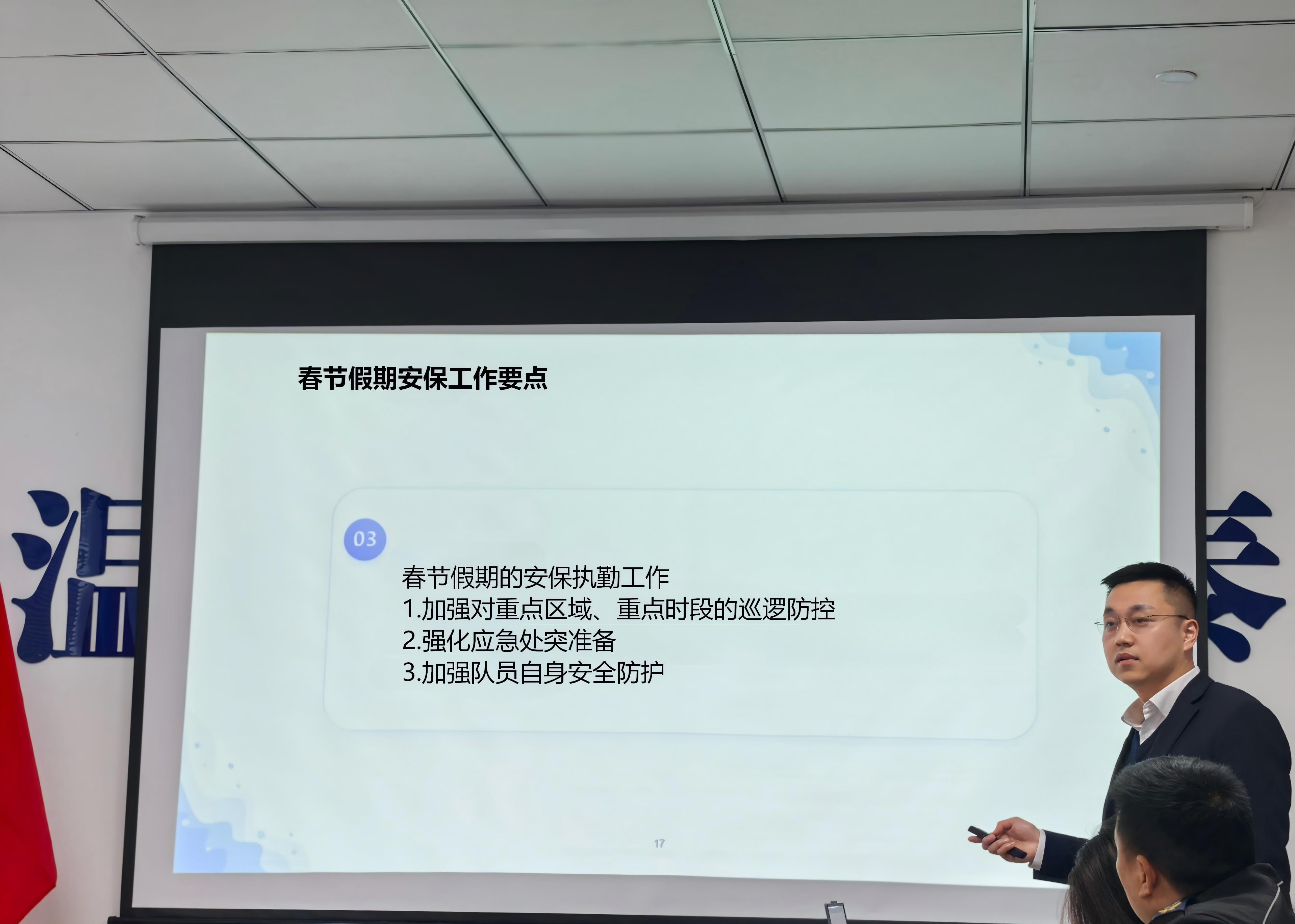 公司副总金露兵针对本次春节假期的安保执勤工作做了系统的安排。他强调,春节期间是安全防范的关键时期,各执勤点要严格落实24小时值班制度,加强对重点区域、重点时段的巡逻防控,特别是针对景区、医院、交通枢纽等人流密集场所,要增加巡逻频次,密切关注人员动态,及时排查安全隐患。同时,要强化应急处突准备,确保应急物资配备齐全、通讯联络畅通,一旦发生突发事件,能够迅速响应、高效处置,坚决保障人民群众生命财产安全和社会秩序稳定。此外,金副总还对执勤人员的自身安全防护提出要求,提醒大家注意防寒保暖,严格遵守操作规程,做到文明执勤、规范执法,展现国泰保安的良好形象。